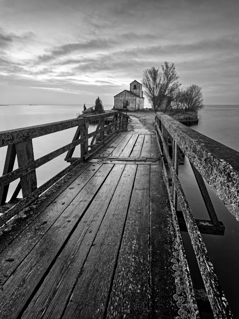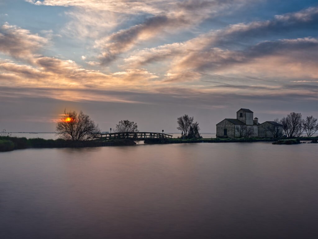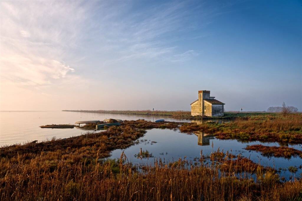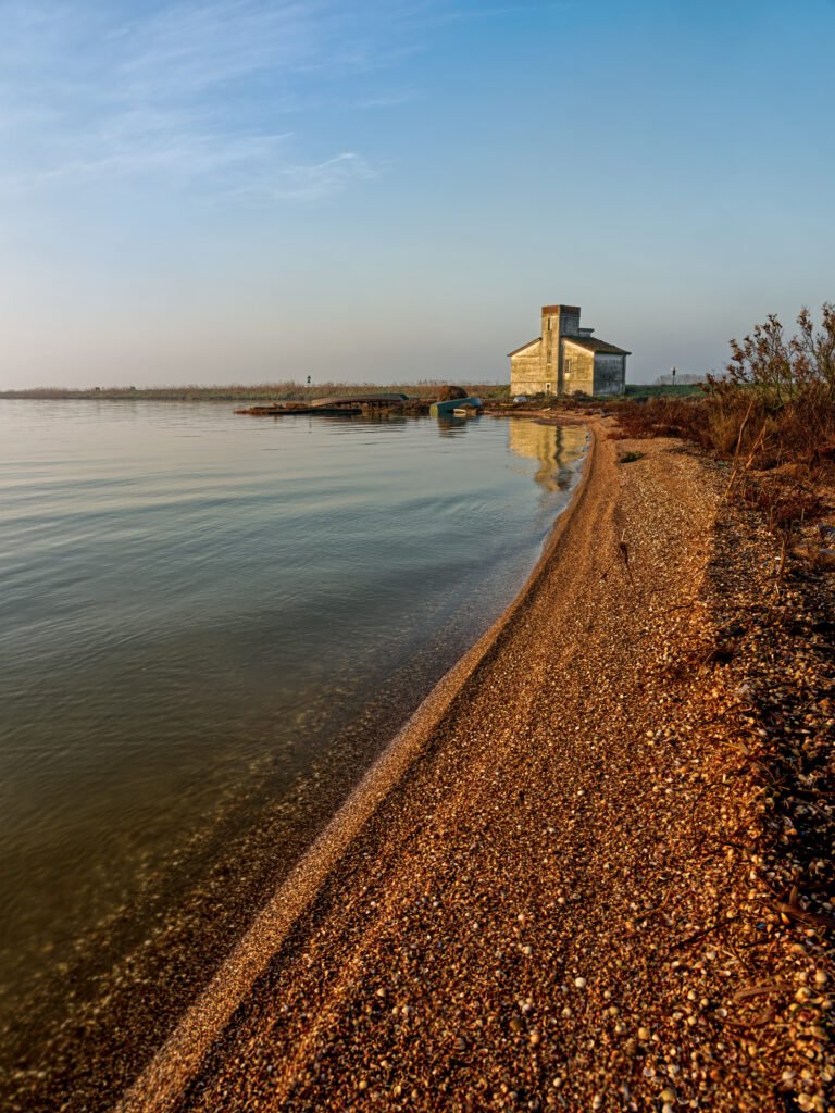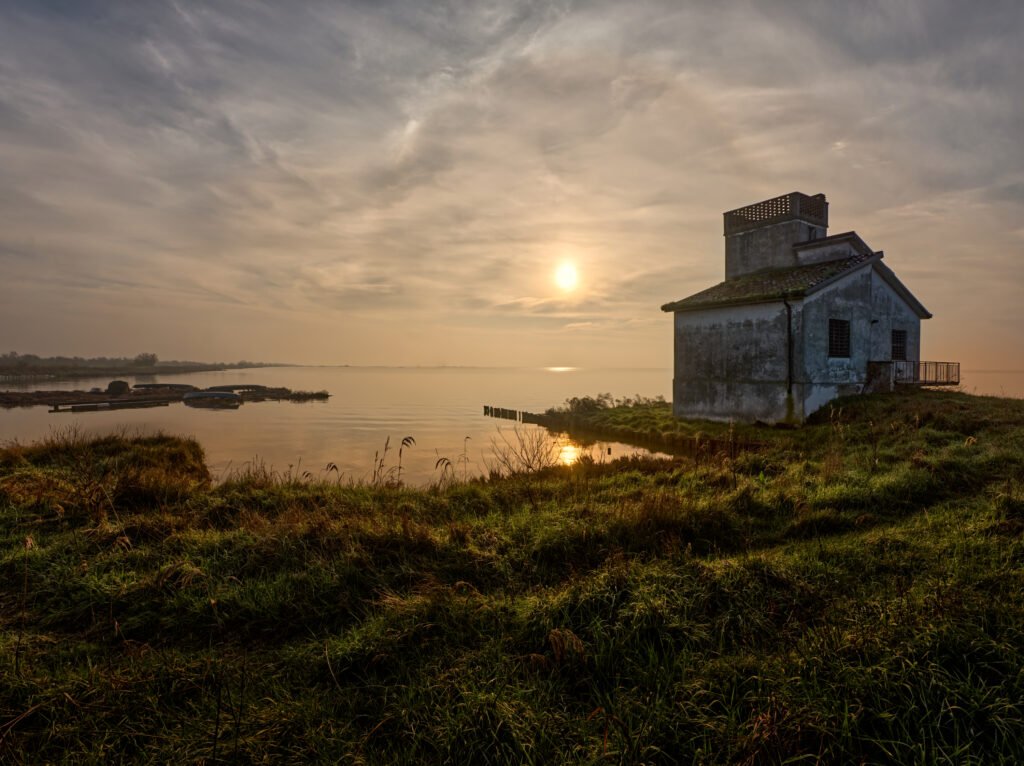 Arrivato, il crepuscolo mi ha fatto capire dove ero: una distesa d’acqua salmastra dove cielo e terra si fondono fino a sparire. Qualche nuvola leggera. Silenzio assoluto.